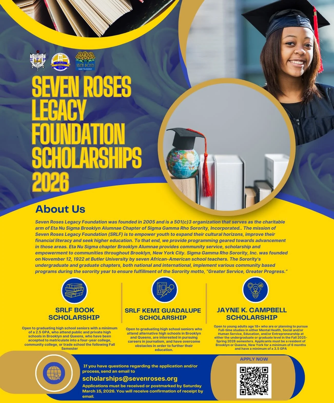 Founded in 2005, the Seven Roses Legacy Foundation is the powerhouse charitable arm of the Eta Nu Sigma Chapter of Sigma Gamma Rho Sorority, Inc. Our mission is robust: to uplift the Brooklyn community by empowering youth to break barriers, expand their cultural and social horizons, master financial literacy, and seize higher education opportunities. Focused on students from economically challenged neighborhoods, we are committed to transforming lives and opening doors to brighter futures in Brooklyn.